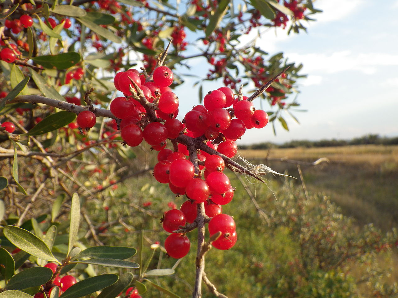 Шефердия – это многолетний кустарник, достигающий высоты 2,5 метра. Её побеги сильно искривлены и переплетаются между собой, особенно у основания, образуя густые заросли. Благодаря многочисленным острым колючкам, шефердия идеально подходит для создания живой изгороди. К концу лета на кустарнике появляются ягоды, которые имеют шарообразную форму и красно-оранжевый или алый цвет. Диаметр ягод составляет 5-6 мм, а их поверхность покрыта характерными белыми пятнами. Собирать ягоды рекомендуется после первых заморозков.
